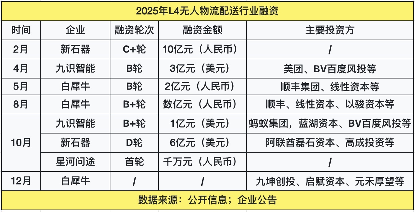 在融资端,资本加速向头部企业集中。例如,新石器在2025年完成两轮融资,累计金额超50亿元人民币,其中10月完成的6亿美元D轮融资由阿联酋磊石资本、高成投资及中国移动等多家机构联合投资;白犀牛于2025年年内完成三轮融资,全年累计融资额达数亿美元,投资方包括顺丰、九坤创投、启赋资本等;九识智能同样完成两轮融资,累计达4亿美元,获得蚂蚁集团、美团等产业资本持续加码。