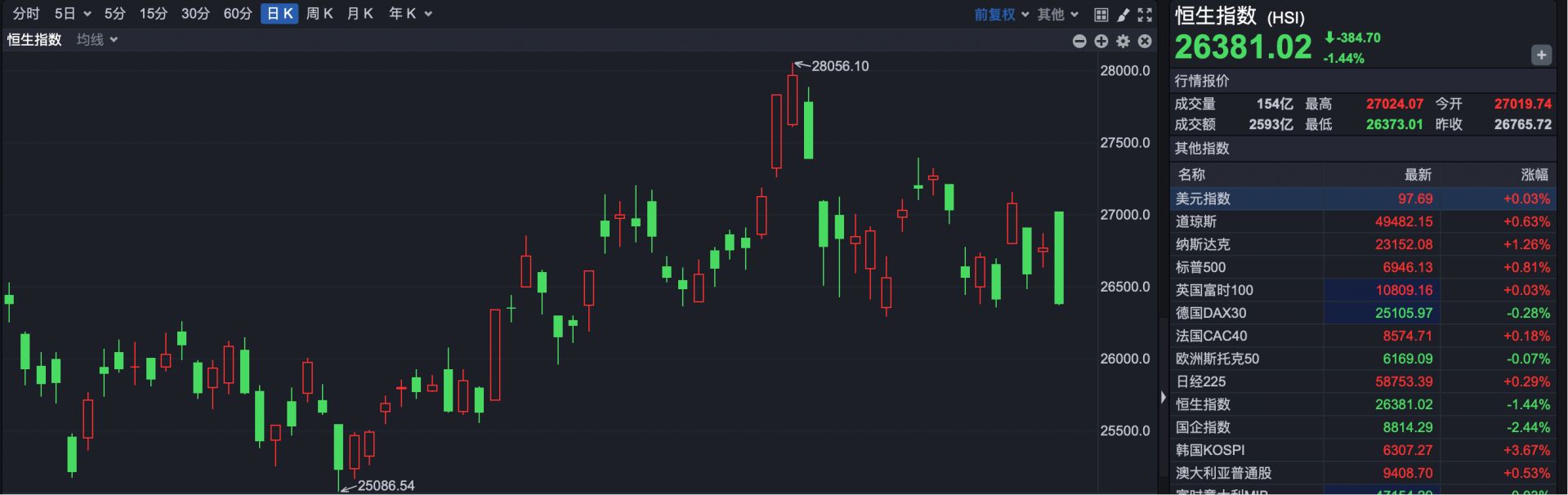 截至收盘,恒生指数报26381.02点,回落384.70点,跌幅1.44%。