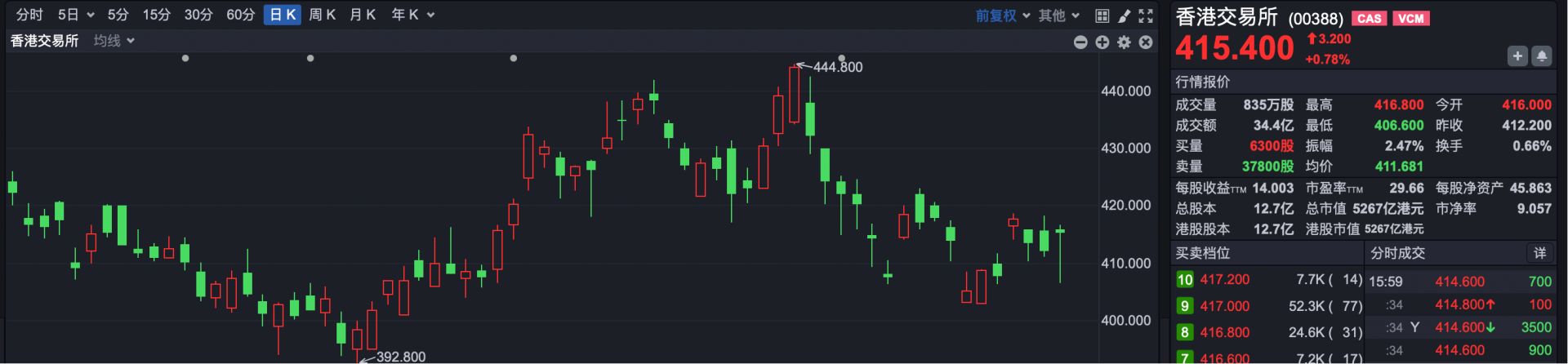 受业绩利好刺激,香港交易所股价今日逆势飘红,最终上涨0.78%。