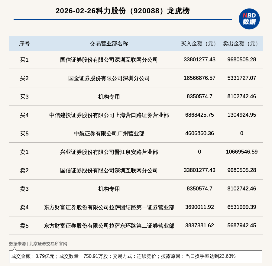 每经讯,2026年2月26日,北交所上市公司科力股份(920088,收盘价:50.16元)登上龙虎榜,交易方式是连续竞价,披露原因是当日换手率达到23.63%,成交数量750.91万股,成交金额3.79亿元。买一席位为国信证券股份有限公司深圳互联网分公司,买入3380.13万元;卖一席位为兴业证券股份有限公司晋江泉安路营业部,卖出1066.95万元。