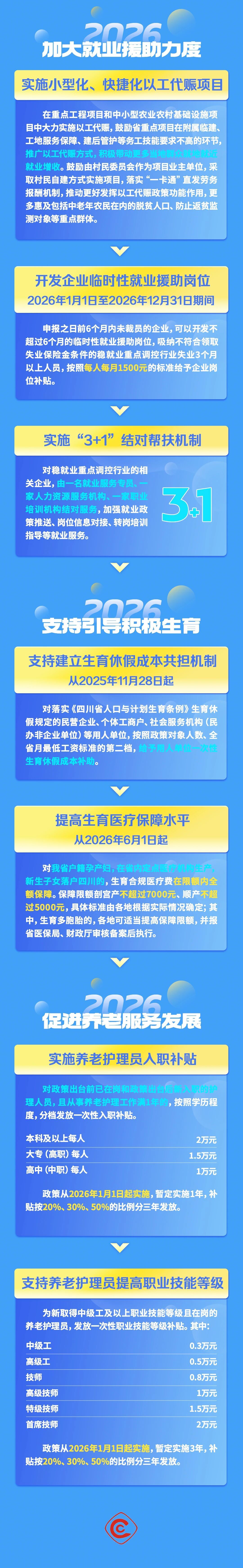 注重挖潜拓新。在拓展就业岗位方面,《政策措施》特别注重在新竣工投产企业和新兴领域企业拓展就业增量。比如,对2026年期间新竣工投产企业,按招用人数分档给予企业招工激励,单户企业最高不超过100万元;对文化、体育、旅游、养老、托育和数字经济等领域的企业,2026年裁员率低、2027年用工人数增加,且稳定就业6个月以上的,根据用工人数分档给予企业扩岗奖补,最高奖补60万元。