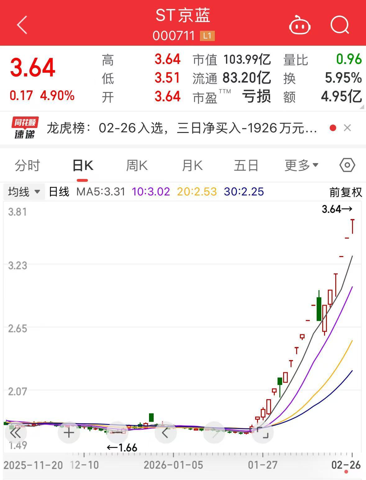 2月26日,ST京蓝再度涨停,股价报3.64元/股,总市值为103.99亿元,该股18个交易日内收获14个涨停。
