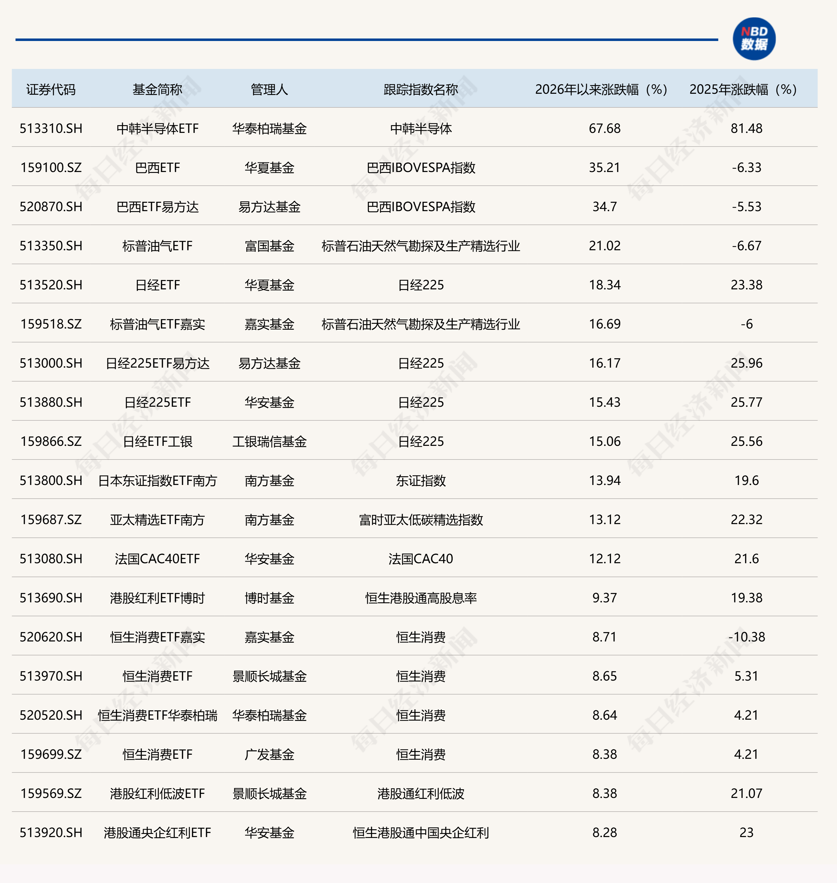 《每日经济新闻》记者获悉,近日包括韩国、巴西、日本、法国等国的股市接连出现大涨,国内公募基金中投资于这些市场的跨境ETF也随之快速走强。