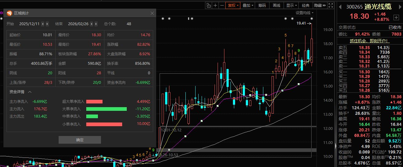 如将时间线拉长,2025年12月11日至2026年2月26日收盘,通光线缆在48个交易日内大涨82.82%,远超同期大盘8.92%的累计涨幅。期间,通光线缆累计成交590.8亿元,累计换手率达856.8%。