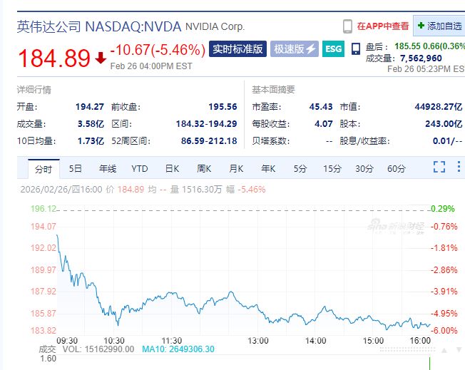 当地时间2月26日,美股三大指数收盘涨跌不一,纳指跌1.18%,标普500指数跌0.54%,道指涨0.03%。
