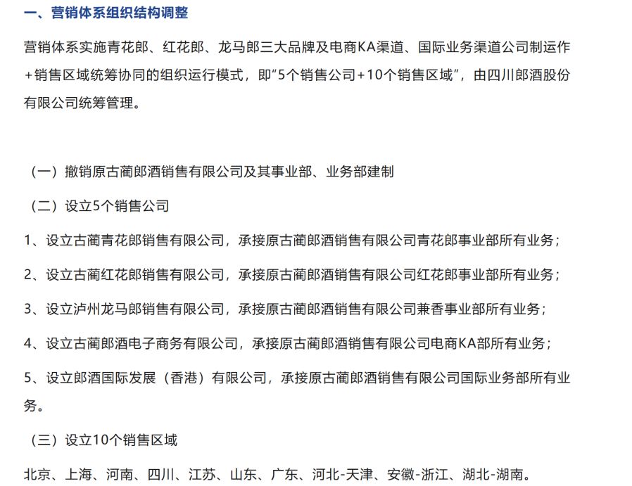 具体来看,5个销售公司分别为古蔺青花郎销售有限公司、古蔺红花郎销售有限公司、泸州龙马郎销售有限公司、古蔺郎酒电子商务有限公司、郎酒国际发展(香港)有限公司,分别承接原来三大事业部以及电商KA部、国际业务的所有业务。