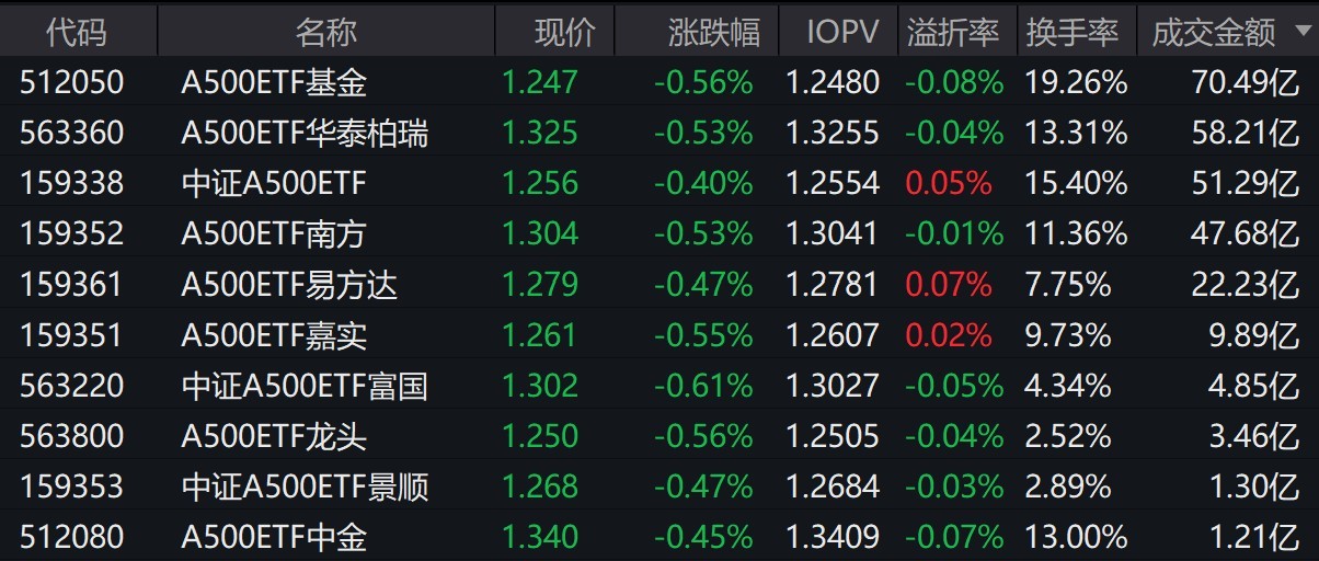 截至上午收盘,场内跟踪中证A500指数的ETF小幅下跌。其中,有10只中证A500相关ETF成交额超1亿元,2只超58亿元。A500ETF基金、A500ETF华泰柏瑞早盘成交额分别为70.49亿元、58.21亿元。
