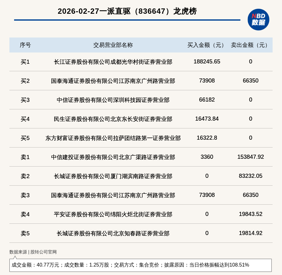 每经讯,2026年2月27日,新三板创新层公司一派直驱(836647,收盘价:31.99元)登上龙虎榜,交易方式是集合竞价,披露原因是当日价格振幅达到108.51%,成交数量1.25万股,成交金额40.77万元。买一席位为长江证券股份有限公司成都光华村街证券营业部,买入18.82万元;卖一席位为中信建投证券股份有限公司北京广渠路证券营业部,卖出15.38万元。