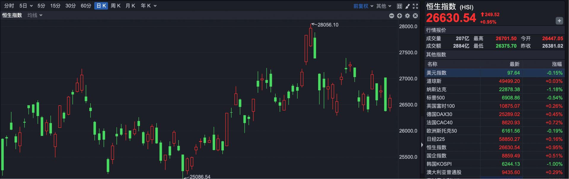 截至收盘,恒生指数报26630.54点,上涨249.52点,涨幅0.95%。整个二月行情,恒生指数累计下跌2.76%