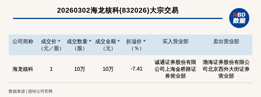 每经讯,2026年3月2日,新三板基础层公司海龙核科(832026,收盘价:1.08元)发生一笔大宗交易,成交价1元/股,成交数量10万股,成交金额10万元,折价7.41%。买入营业部是诚通证券股份有限公司上海金桥路证券营业部,卖出营业部是渤海证券股份有限公司北京西外大街证券营业部。