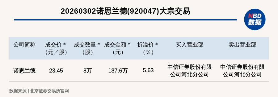 每经讯,2026年3月2日,北交所上市公司诺思兰德(920047,收盘价:22.2元)发生一笔大宗交易,成交价23.45元/股,成交数量8万股,成交金额187.6万元,溢价5.63%。买入营业部是中信证券股份有限公司河北分公司,卖出营业部是中信证券股份有限公司河北分公司。