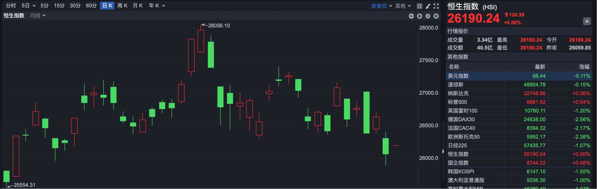 截至发稿,恒生指数开盘报26190.24点,上涨130.39点,涨幅0.50%。