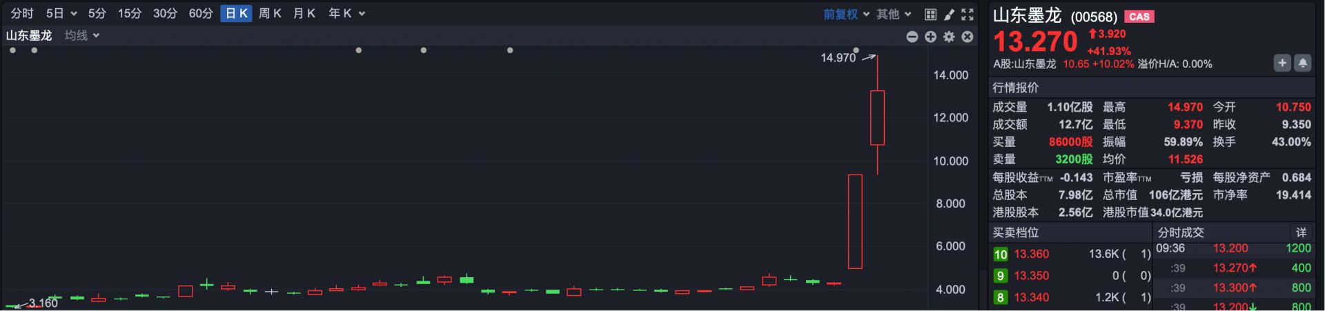 其中,昨日涨超110%的山东墨龙(HK00568),今日早间一度涨超60%。此外,中港石油涨超70%,百勤油服一度涨超100%,中石化油服涨超20%。