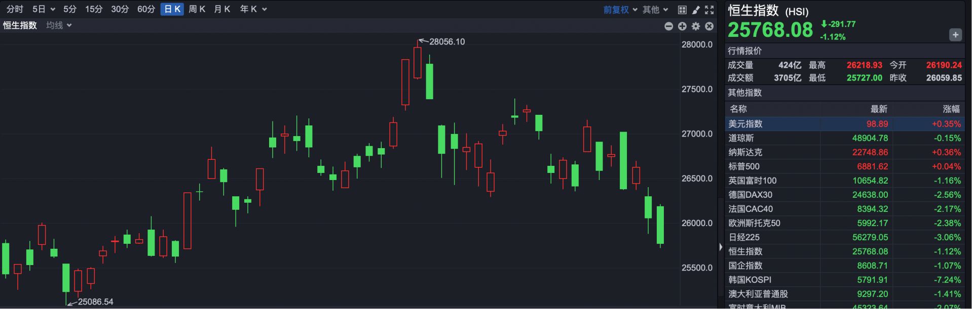 截至收盘,恒生指数报25768.08点,下跌291.77点,跌幅1.12%。