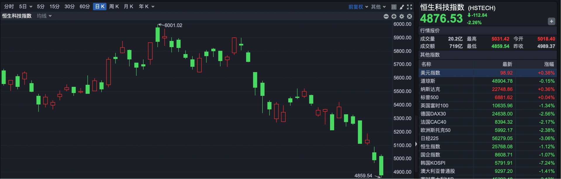 恒生科技指数收盘报4876.53点,下跌112.84点,跌幅2.26%。