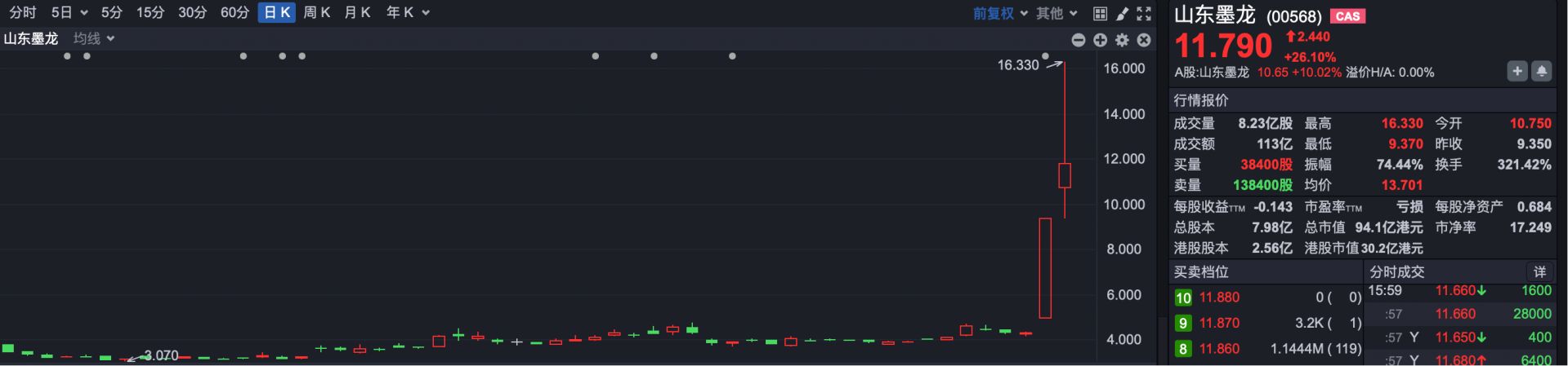 焦点方面,油气板块继续成为短线热钱“避风港”。其中,中油燃气(HK00603)涨超119%,百勤油服(HK02178)涨超70%,中港石油(HK00632)涨超48%。值得注意的是,昨日翻倍的山东墨龙(HK00568)今日巨幅震荡,盘中一度再涨70%,但午后涨幅收窄,最终上涨26%。