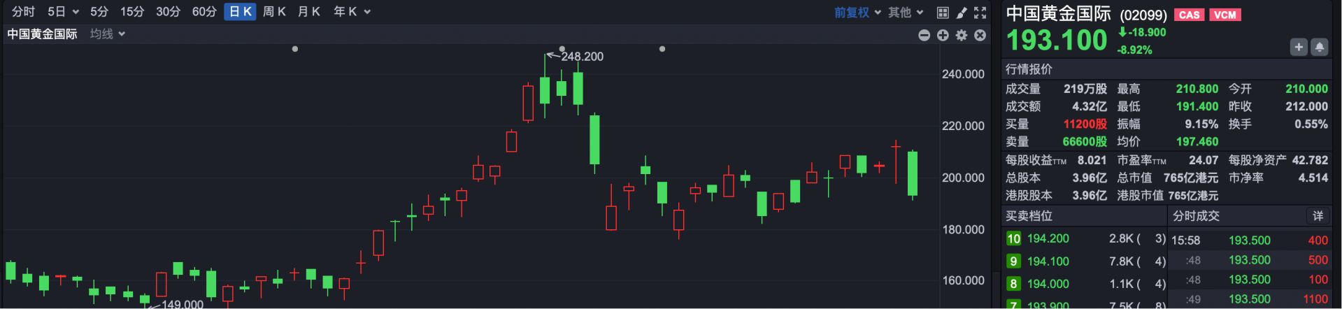 黄金股全线回调,中国黄金国际跌超8%,灵宝黄金跌超7%,招金矿业、紫金矿业跌超6%。