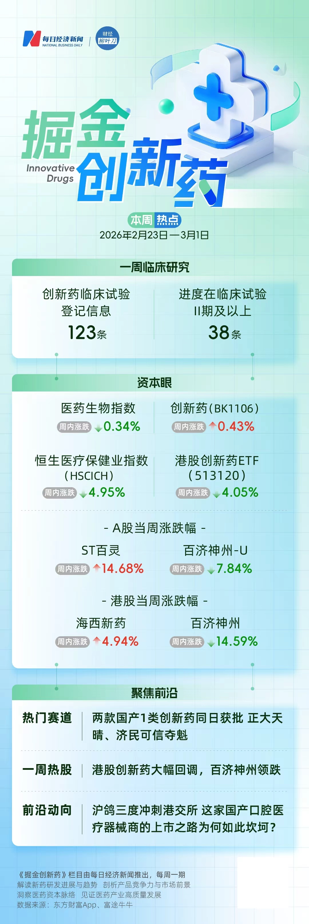 上周(2月24日至27日)医药生物指数跌0.34%,跑输上证指数,港股创新药大幅回调。资金面上,外资流出港股医药,南向资金转向其他板块。沪鸽再度冲刺港交所,其上市之路坎坷,正畸业务面临挑战。此外,当周5款创新药获批,2025年超半数新靶点由中国团队发现。两款国产1类创新药同日获批。