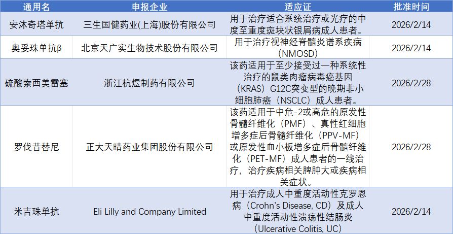 医药魔方数据显示,2月28日,正大天晴药业的罗伐昔替尼片(全球首创JAK/ROCK双靶点抑制剂)与济民可信子公司浙江杭煜制药的硫酸索西美雷塞片(KRAS G12C抑制剂)分别获得国家药品监督管理局批准上市。