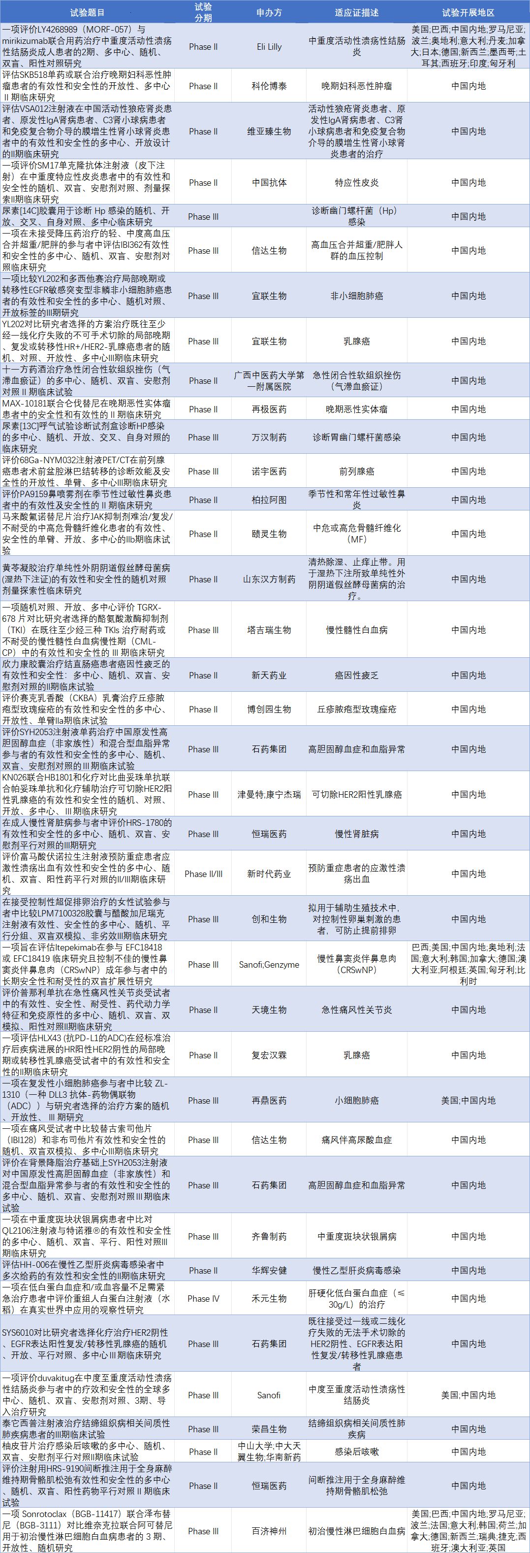 根据医药魔方提供的数据,2月23日至3月1日,国家药品监督管理局药品审评中心共披露123条临床试验登记信息,其中38条为处于临床试验II期及以上的创新药新登记临床试验信息,3个临床研究项目正在招募患者。