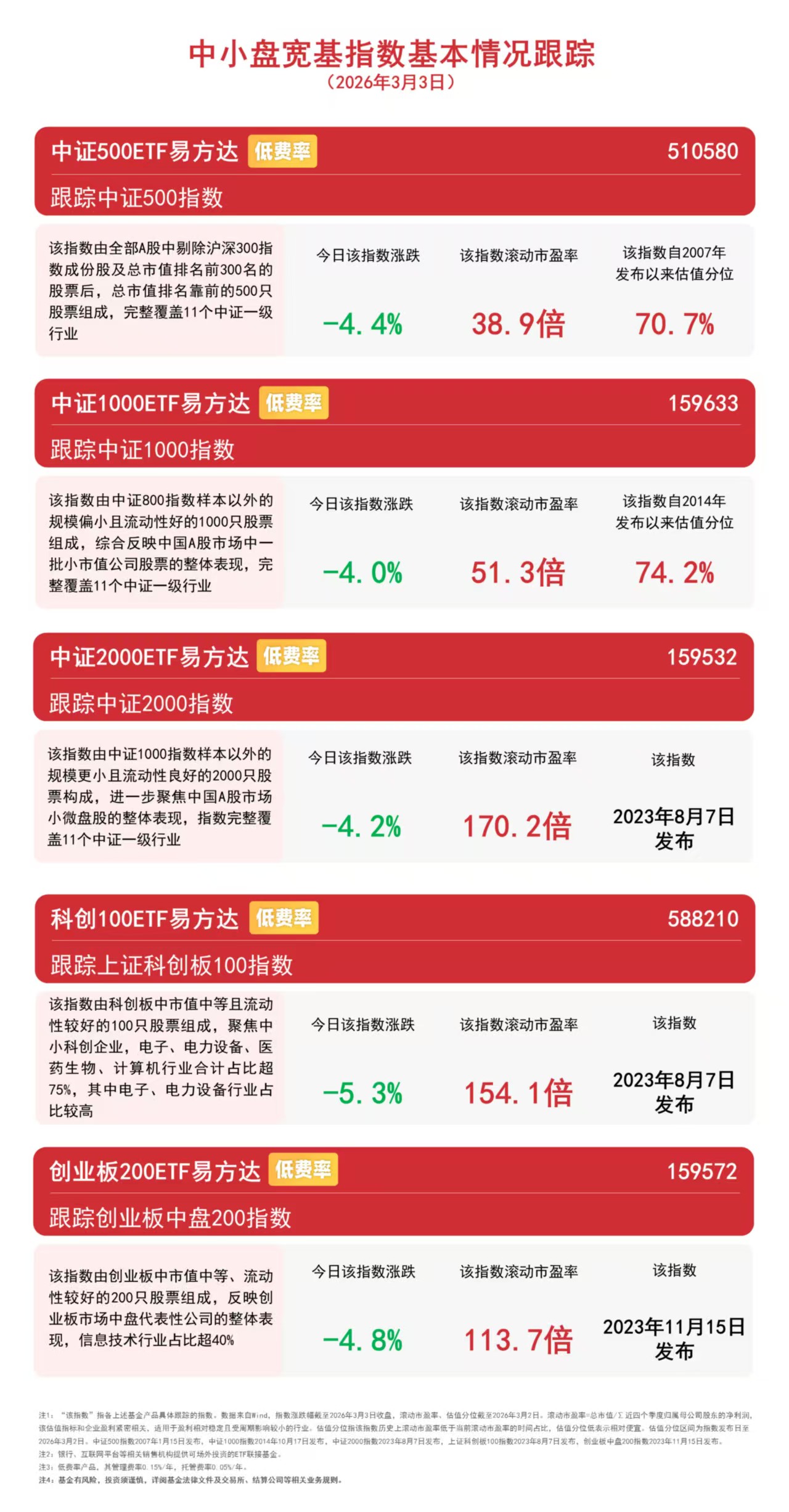 截至收盘,中证500指数下跌4.4%,中证1000指数下跌4.0%,中证2000指数下跌4.2%,科创100指数下跌5.3%,创业板中盘200指数下跌4.8%。