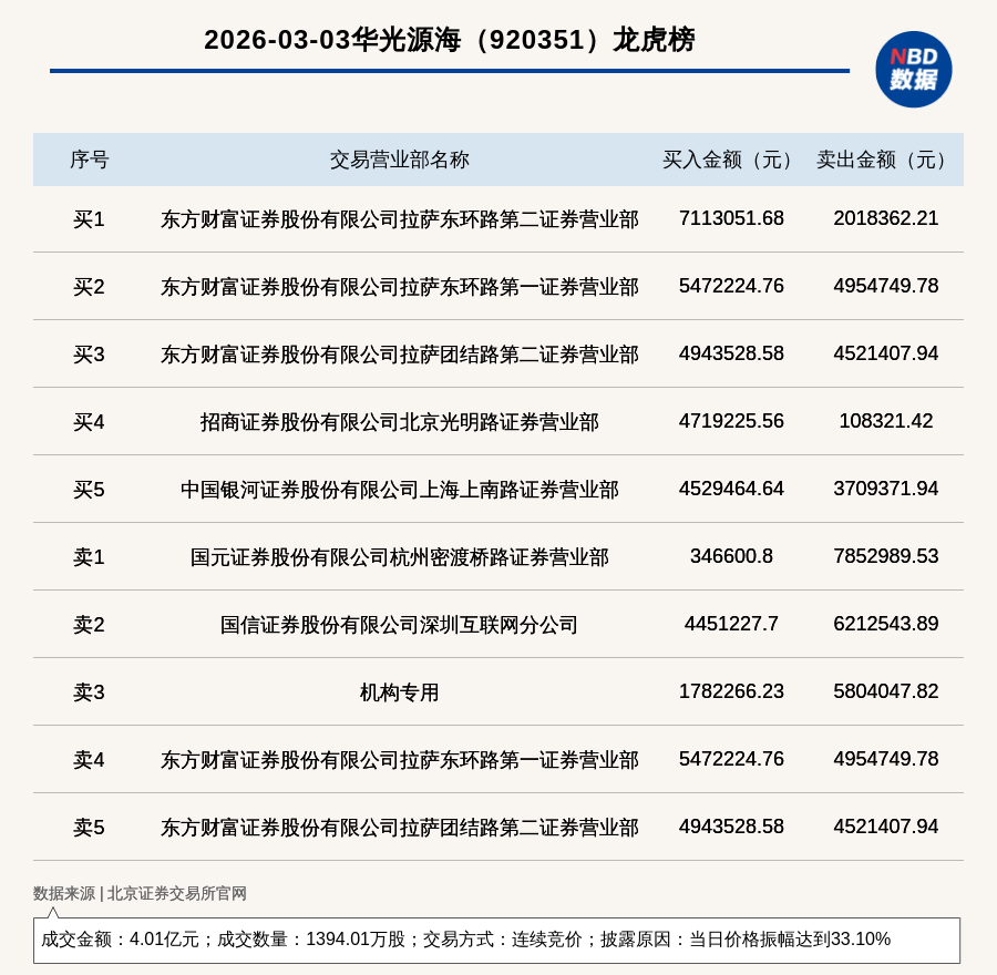 每经讯,2026年3月3日,北交所上市公司华光源海(920351,收盘价:31.94元)登上龙虎榜,交易方式是连续竞价,披露原因是当日价格振幅达到33.10%,成交数量1394.01万股,成交金额4.01亿元。买一席位为东方财富证券股份有限公司拉萨东环路第二证券营业部,买入711.31万元;卖一席位为国元证券股份有限公司杭州密渡桥路证券营业部,卖出785.3万元。