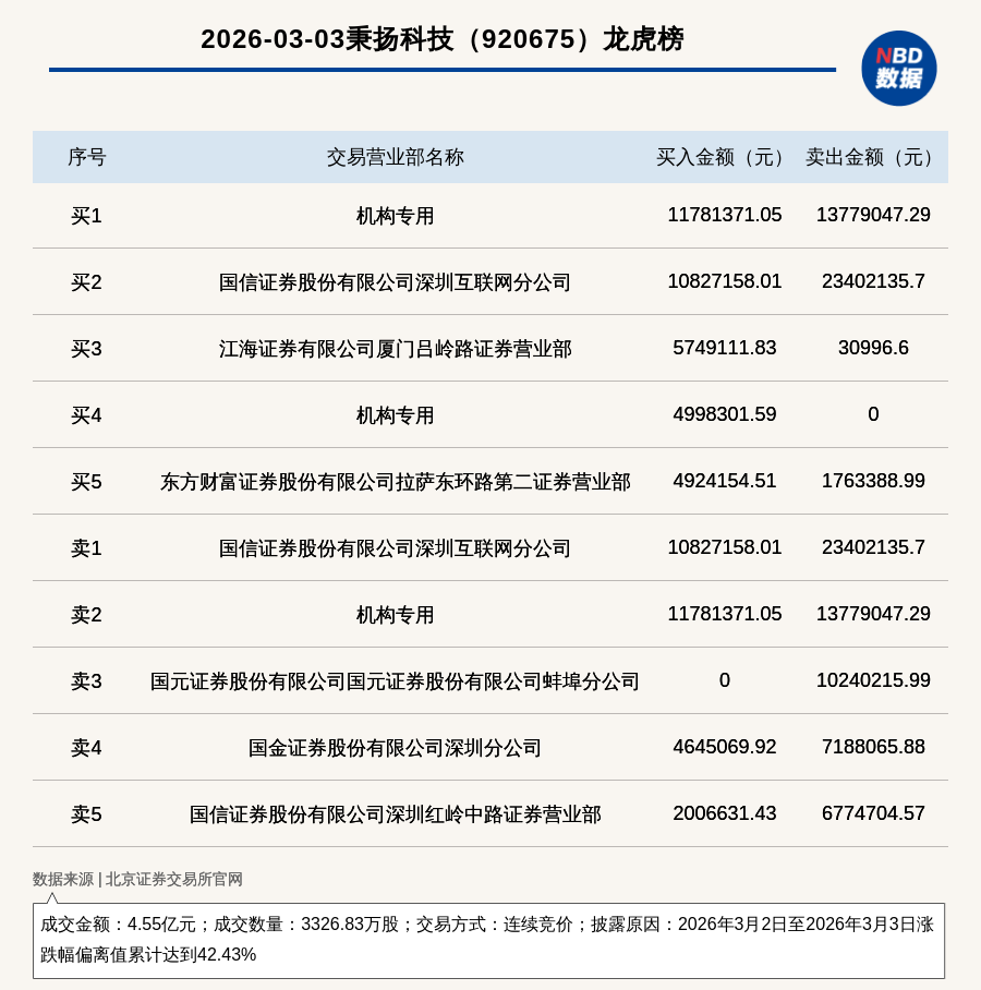 每经讯,2026年3月3日,北交所上市公司秉扬科技(920675,收盘价:15.87元)登上龙虎榜,交易方式是连续竞价,披露原因是2026年3月2日至2026年3月3日涨跌幅偏离值累计达到42.43%,成交数量3326.83万股,成交金额4.55亿元。买一席位为机构专用,买入1178.14万元;卖一席位为国信证券股份有限公司深圳互联网分公司,卖出2340.21万元。