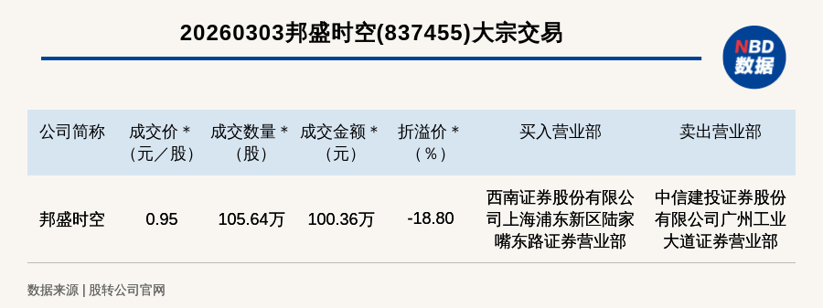 每经讯,2026年3月3日,新三板创新层公司邦盛时空(837455,收盘价:1.17元)发生一笔大宗交易,成交价0.95元/股,成交数量105.64万股,成交金额100.36万元,折价18.8%。买入营业部是西南证券股份有限公司上海浦东新区陆家嘴东路证券营业部,卖出营业部是中信建投证券股份有限公司广州工业大道证券营业部。