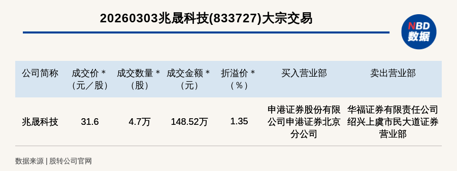 每经讯,2026年3月3日,新三板创新层公司兆晟科技(833727,收盘价:31.18元)发生一笔大宗交易,成交价31.6元/股,成交数量4.7万股,成交金额148.52万元,溢价1.35%。买入营业部是申港证券股份有限公司申港证券北京分公司,卖出营业部是华福证券有限责任公司绍兴上虞市民大道证券营业部。
