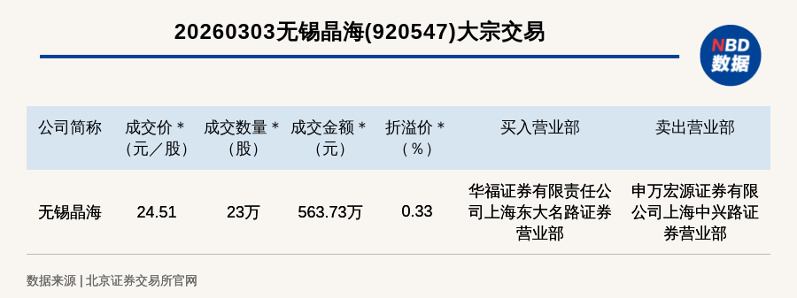 每经讯,2026年3月3日,北交所上市公司无锡晶海(920547,收盘价:24.43元)发生一笔大宗交易,成交价24.51元/股,成交数量23万股,成交金额563.73万元,溢价0.33%。买入营业部是华福证券有限责任公司上海东大名路证券营业部,卖出营业部是申万宏源证券有限公司上海中兴路证券营业部。
