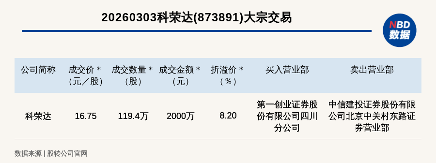 每经讯,2026年3月3日,新三板创新层公司科荣达(873891,收盘价:15.48元)发生一笔大宗交易,成交价16.75元/股,成交数量119.4万股,成交金额2000万元,溢价8.2%。买入营业部是第一创业证券股份有限公司四川分公司,卖出营业部是中信建投证券股份有限公司北京中关村东路证券营业部。