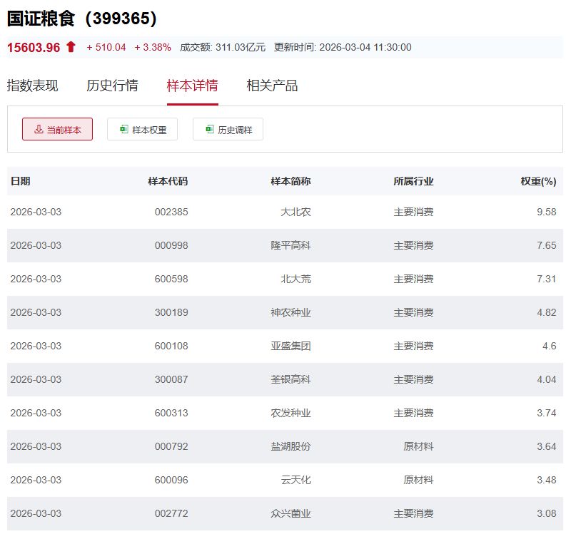 国证粮食产业指数主要权重股