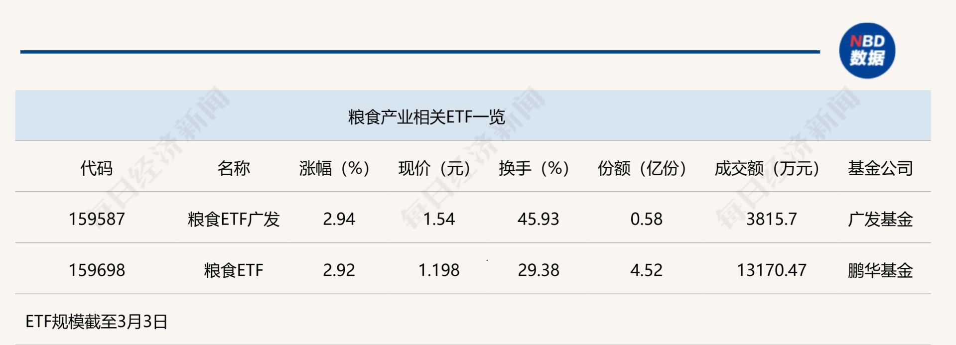 点评:粮食ETF广发(159587)和粮食ETF(159698)今日上午涨幅分别达到2.94%和2.92%,其中,粮食ETF(159698)规模相对较大,其份额为4.52亿份,半日成交金额为1.32亿元。上述两只ETF追踪的是国证粮食产业指数,该指数反映沪深北交易所粮食产业相关上市公司的证券价格变化情况。