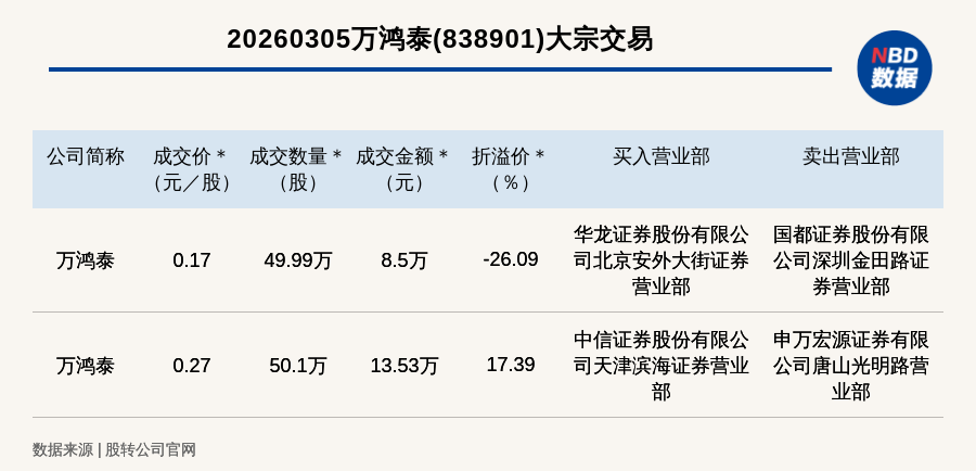 每经讯,2026年3月5日,新三板基础层公司万鸿泰(838901,收盘价:0.23元)发生2笔大宗交易,折价率最高的一笔成交价0.17元/股,成交数量49.99万股,成交金额8.5万元,折价26.09%。买入营业部是华龙证券股份有限公司北京安外大街证券营业部,卖出营业部是国都证券股份有限公司深圳金田路证券营业部。