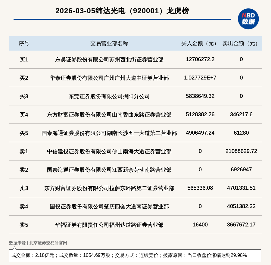 每经讯,2026年3月5日,北交所上市公司纬达光电(920001,收盘价:21.33元)登上龙虎榜,交易方式是连续竞价,披露原因是当日收盘价涨幅达到29.98%,成交数量1054.69万股,成交金额2.18亿元。买一席位为东吴证券股份有限公司苏州西北街证券营业部,买入1270.63万元;卖一席位为中信建投证券股份有限公司佛山南海大道证券营业部,卖出2108.86万元。