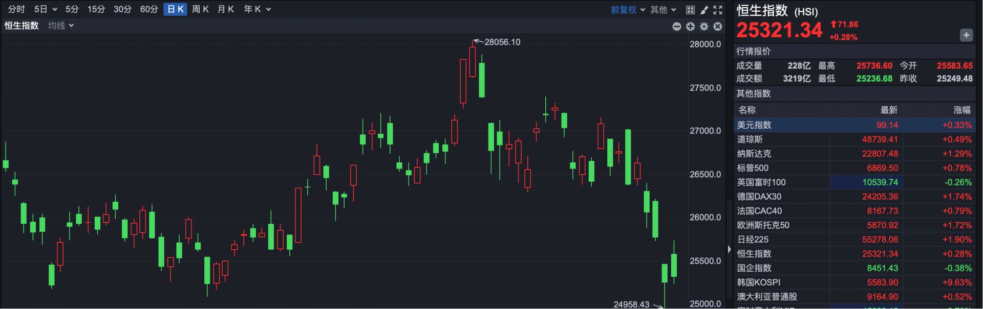 截至收盘,恒生指数报25321.34点,上涨71.86点,涨幅0.28%。