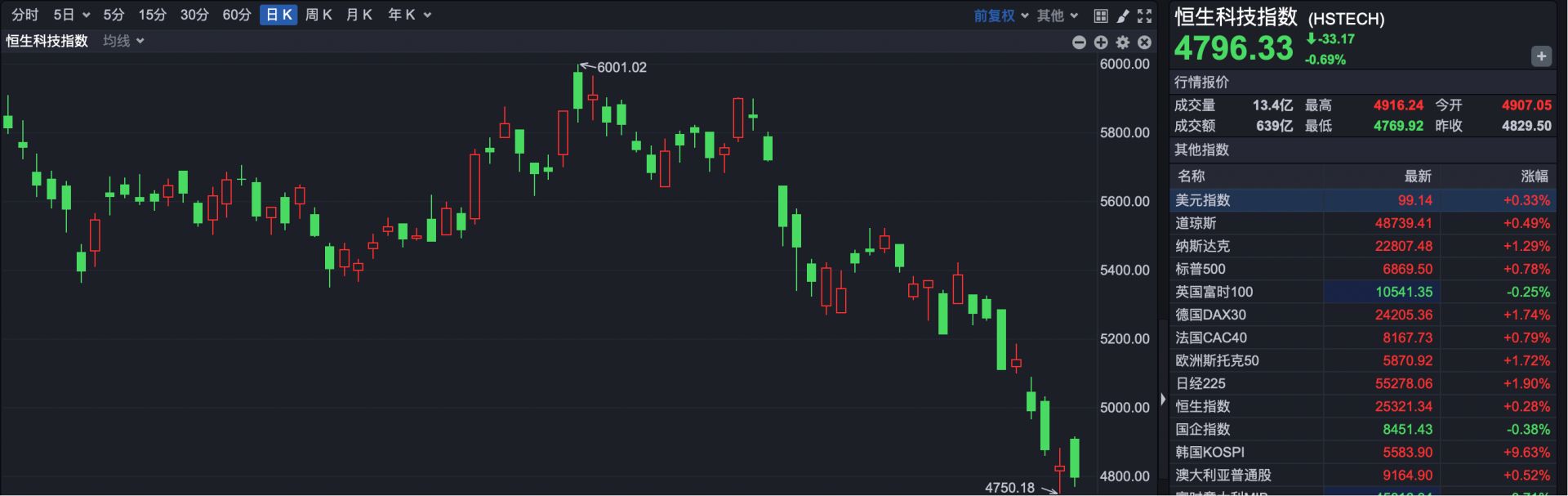 恒生科技指数早盘高开,但随后一路走低,最终收盘报4796.33点,下跌33.17点,跌幅0.69%。