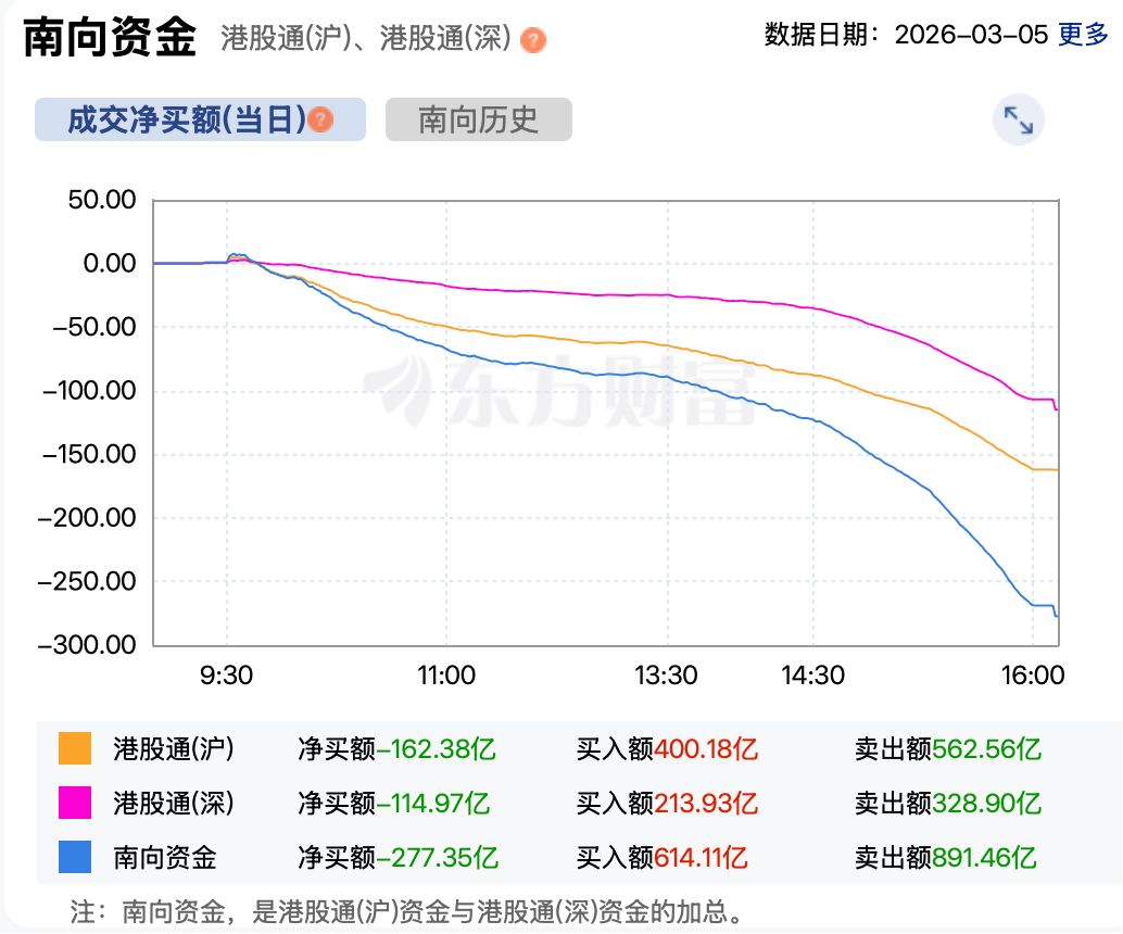 资金方面,今日南向资金罕见大撤退。截至收盘,南向资金净卖出港股超277亿港元,创下历史纪录。