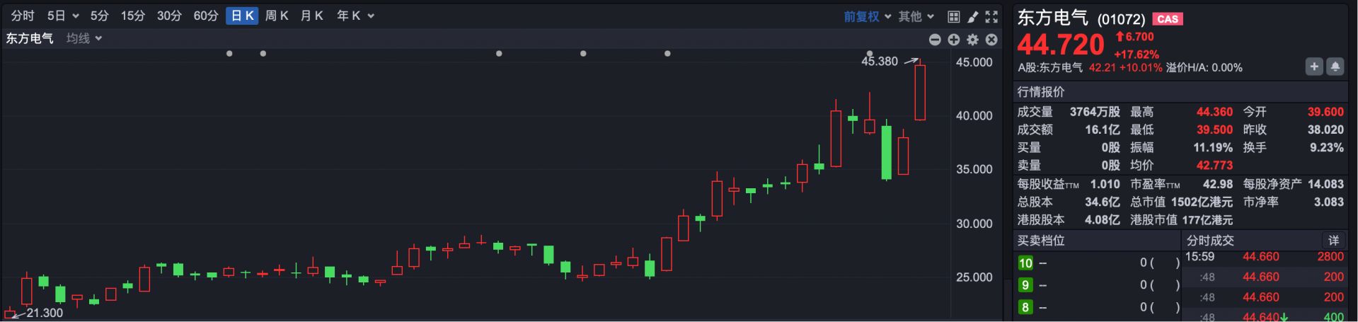 再看其他热点,风电股强势,东方电气(HK01072)涨超17%。