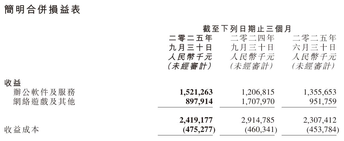 从业务结构来看,金山软件早已形成“办公业务独扛大旗”的格局。2025年第三季度财报显示,公司整体营收24.2亿元,同比下降17%;净利润2.13亿元,同比锐减48%,核心分化在于两大业务的“冰火两重天”:办公软件及服务业务(主要由金山办公贡献)营收15.21亿元,同比增长26%,成为集团最稳定的现金牛与增长引擎;而网络游戏及其他业务营收仅8.97亿元,同比下跌47%,占比进一步萎缩,成为影响集团业绩的主要因素。