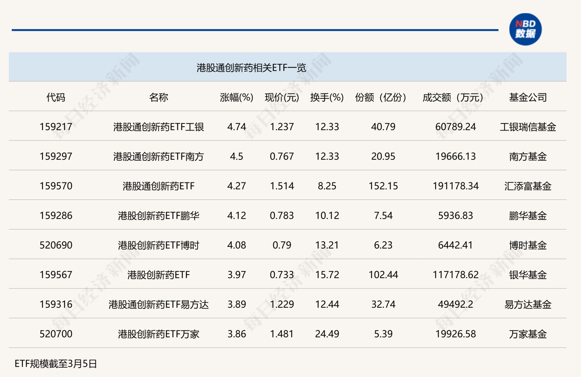 点评:港股通创新药ETF工银(159217)今日上午涨幅为4.74%,其份额为40.79亿份,半日成交金额为6.08亿元,该ETF追踪的是国证港股通创新药指数,追踪该指数的ETF还包括港股通创新药ETF南方(159297)、港股通创新药ETF(159570)等。其中,港股通创新药ETF(159570)半日涨幅为4.27%,其份额达到152.15亿份,半日成交金额达到19.12亿元。