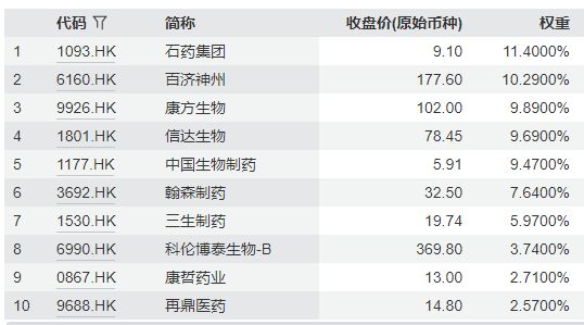 恒生沪深港创新药精选指数主要权重股