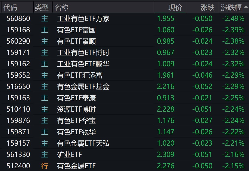 受盘面影响,有色相关ETF跌超2%。
