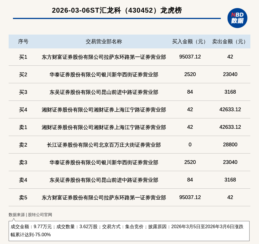 每经讯,2026年3月6日,新三板基础层公司ST汇龙科(430452,收盘价:0.42元)登上龙虎榜,交易方式是集合竞价,披露原因是2026年3月5日至2026年3月6日涨跌幅累计达到-75.00%,成交数量3.62万股,成交金额9.77万元。买一席位为东方财富证券股份有限公司拉萨东环路第一证券营业部,买入9.5万元;卖一席位为湘财证券股份有限公司湘财证券上海江宁路证券营业部,卖出4.26万元。