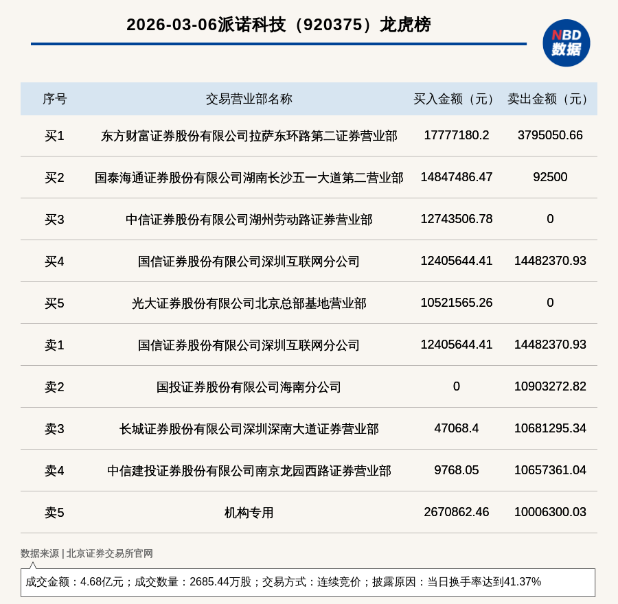 每经讯,2026年3月6日,北交所上市公司派诺科技(920375,收盘价:16.88元)登上龙虎榜,交易方式是连续竞价,披露原因是当日换手率达到41.37%,成交数量2685.44万股,成交金额4.68亿元。买一席位为东方财富证券股份有限公司拉萨东环路第二证券营业部,买入1777.72万元;卖一席位为国信证券股份有限公司深圳互联网分公司,卖出1448.24万元。