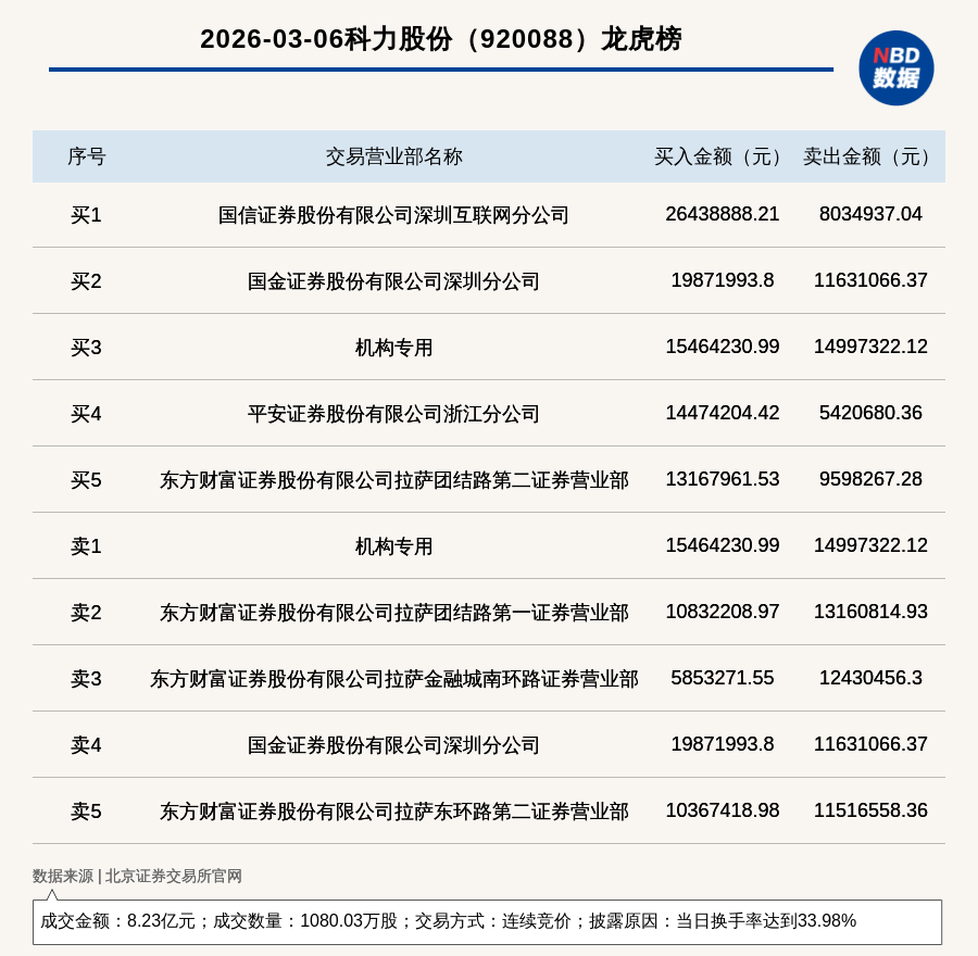 每经讯,2026年3月6日,北交所上市公司科力股份(920088,收盘价:73.3元)登上龙虎榜,交易方式是连续竞价,披露原因是当日换手率达到33.98%,成交数量1080.03万股,成交金额8.23亿元。买一席位为国信证券股份有限公司深圳互联网分公司,买入2643.89万元;卖一席位为机构专用,卖出1499.73万元。