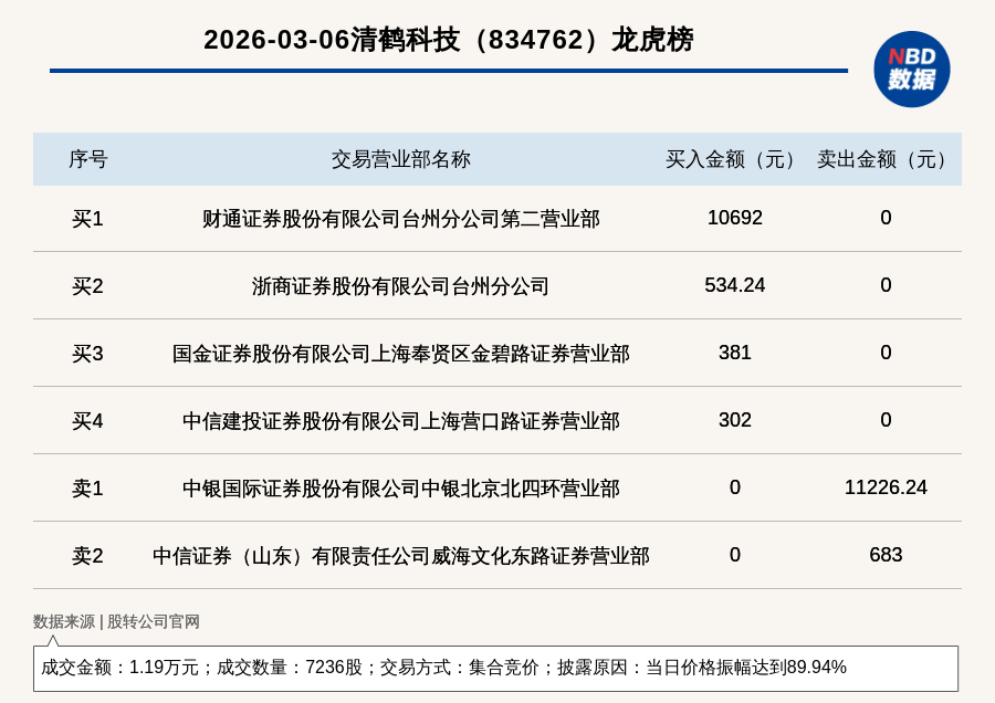 每经讯,2026年3月6日,新三板创新层公司清鹤科技(834762,收盘价:1.99元)登上龙虎榜,交易方式是集合竞价,披露原因是当日价格振幅达到89.94%,成交数量7236股,成交金额1.19万元。买一席位为财通证券股份有限公司台州分公司第二营业部,买入1.07万元;卖一席位为中银国际证券股份有限公司中银北京北四环营业部,卖出1.12万元。