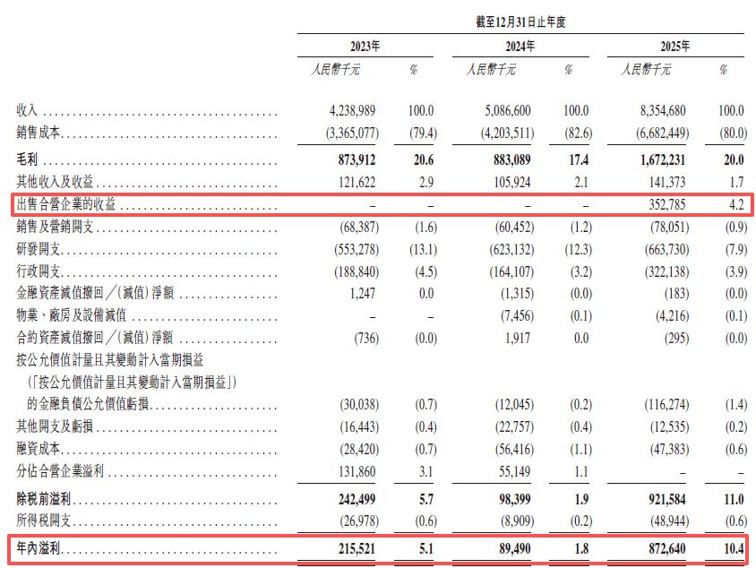 在此背景下,纳真科技2025年的年内溢利包含了较大比例的非经常性项目。招股书显示,2023年公司录得年内溢利约2.16亿元(净利率5.1%);2024年,年内溢利下滑58.5%至约8949万元(净利率1.8%),主要归因于毛利率下滑;2025年,年内溢利大增至约8.73亿元(净利率10.4%)。