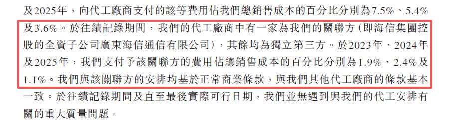 具体来看,海信集团在2023年为纳真科技第一大供应商(采购额2.3亿元,占6.9%),2024年为第二大供应商(3.27亿元,占5.9%),2025年为第四大供应商(2.35亿元,占3.3%)。此外,纳真科技委聘的代工厂商中有一家为海信集团全资子公司,近三年支付的代工费分别占总销售成本的1.9%、2.4%及1.1%。