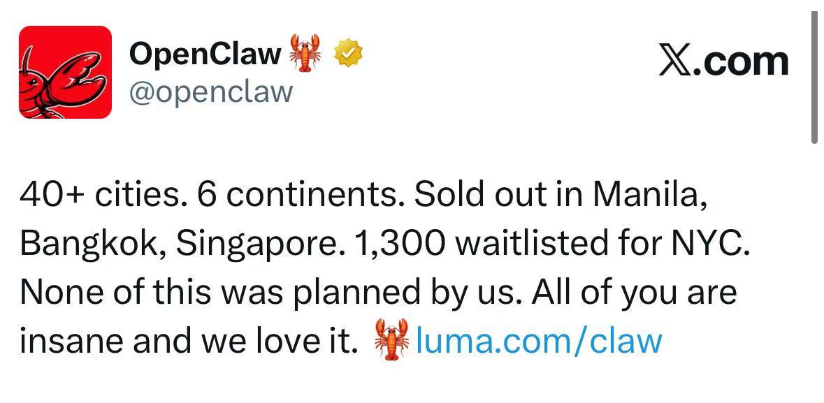2月底,OpenClaw的热潮已迅速蔓延至全球6大洲、40多座城市。多地线下活动已全部售罄,纽约场次千人排队候补。3月6日,腾讯云官宣线下免费安装OpenClaw。当天,近千名开发者与AI爱好者在深圳腾讯大厦门口排长队,在腾讯云工程师的协助下完成OpenClaw云端安装。